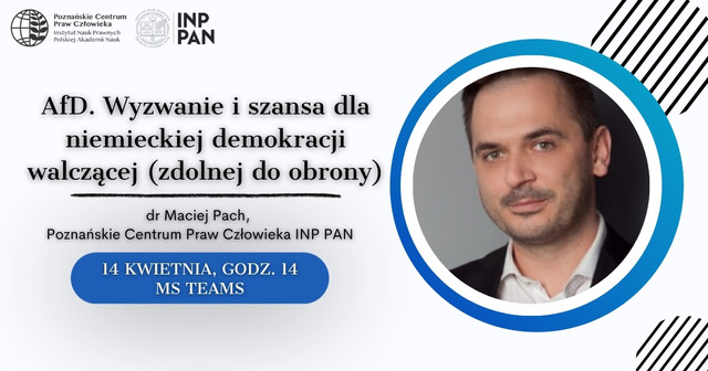 Poznańskie Centrum Praw Człowieka INP PAN serdecznie zaprasza na otwarte seminarium naukowe pt. „AfD. Wyzwanie i szansa dla niemieckiej demokracji walczącej (zdolnej do obrony)”, które odbędzie się 14 kwietnia 2026 r. o godz. 14:00 na platformie MS Teams ![]()